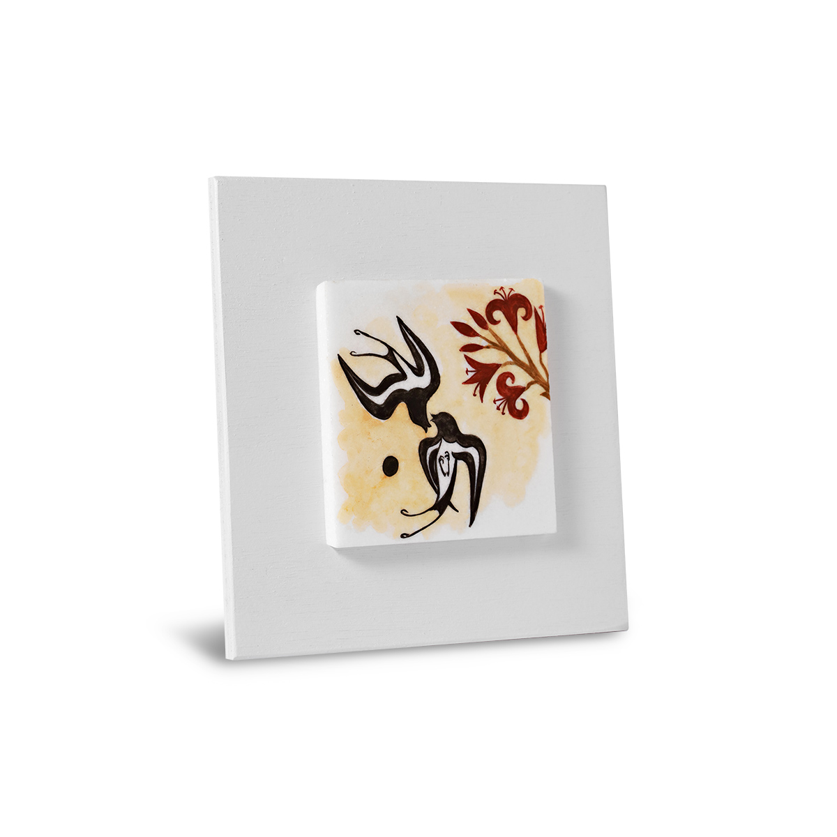 Λευκό ελληνικό μάρμαρο, ζωγραφισμένο στο χέρι και εμπνευσμένο από τα μινωικά φρέσκα της Κνωσού και της Σαντορίνης. Ζωντανά χρώματα και κομψές κινήσεις αναβιώνουν την αισθητική του αρχαιότερου ευρωπαϊκού πολιτισμού. Κάθε κομμάτι είναι μοναδικό, υπογεγραμμένο από τον καλλιτέχνη και συνοδεύεται από πιστοποιητικό γνησιότητας. Το μάρμαρο είναι κολλημένο σε κόντρα πλακέ θαλάσσης, ενώ μπορείτε να επιλέξετε ανάμεσα σε 4 προτεινόμενα χρώματα για το ξύλο, ώστε να ταιριάζει απόλυτα στον χώρο και στο προσωπικό σας γούστο.