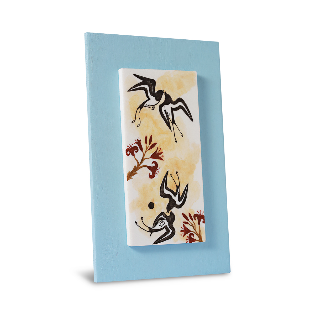 Λευκό ελληνικό μάρμαρο, ζωγραφισμένο στο χέρι και εμπνευσμένο από τα μινωικά φρέσκα της Κνωσού και της Σαντορίνης. Ζωντανά χρώματα και κομψές κινήσεις αναβιώνουν την αισθητική του αρχαιότερου ευρωπαϊκού πολιτισμού. Κάθε κομμάτι είναι μοναδικό, υπογεγραμμένο από τον καλλιτέχνη και συνοδεύεται από πιστοποιητικό γνησιότητας. Το μάρμαρο είναι κολλημένο σε κόντρα πλακέ θαλάσσης, ενώ μπορείτε να επιλέξετε ανάμεσα σε 4 προτεινόμενα χρώματα για το ξύλο, ώστε να ταιριάζει απόλυτα στον χώρο και στο προσωπικό σας γούστο.